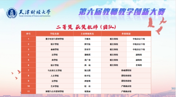 天津财经大学第六届全国高校教师教学创新大赛校赛于近日圆满落幕。本次校赛经过学院选拔推荐、校外专家材料网评和参赛教师现场创新汇报评审,最终评选出一等奖15项、二等奖11项、优秀组织奖3项。校党委副书记、校长孟昊出席大赛颁奖典礼并讲话。