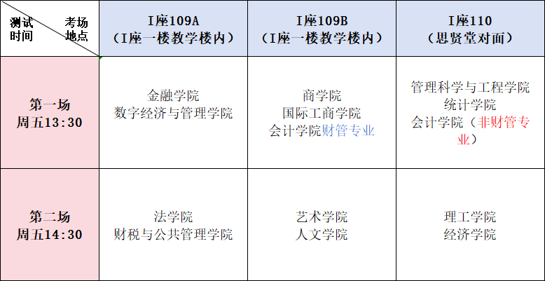 5.请考生按照所在学院对应的时间到相应考场参加测试: