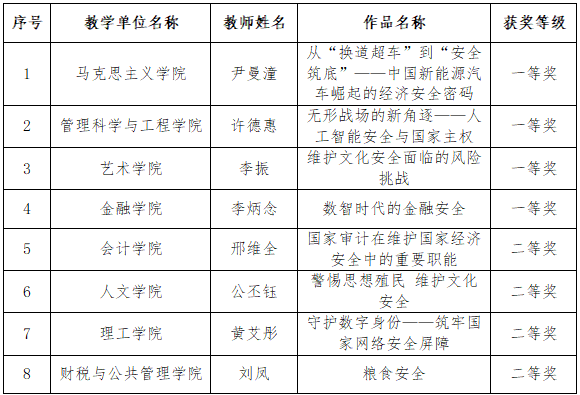 根据《关于印发2026年全市教育系统“4·15”系列活动总方案的通知》(津教国安函〔2026〕1号)等文件精神,学校组织开展了2026年度国家安全教育课程教学比武校级选拔赛。经个人申请、学院推荐、校赛评审,现将结果公布如下: